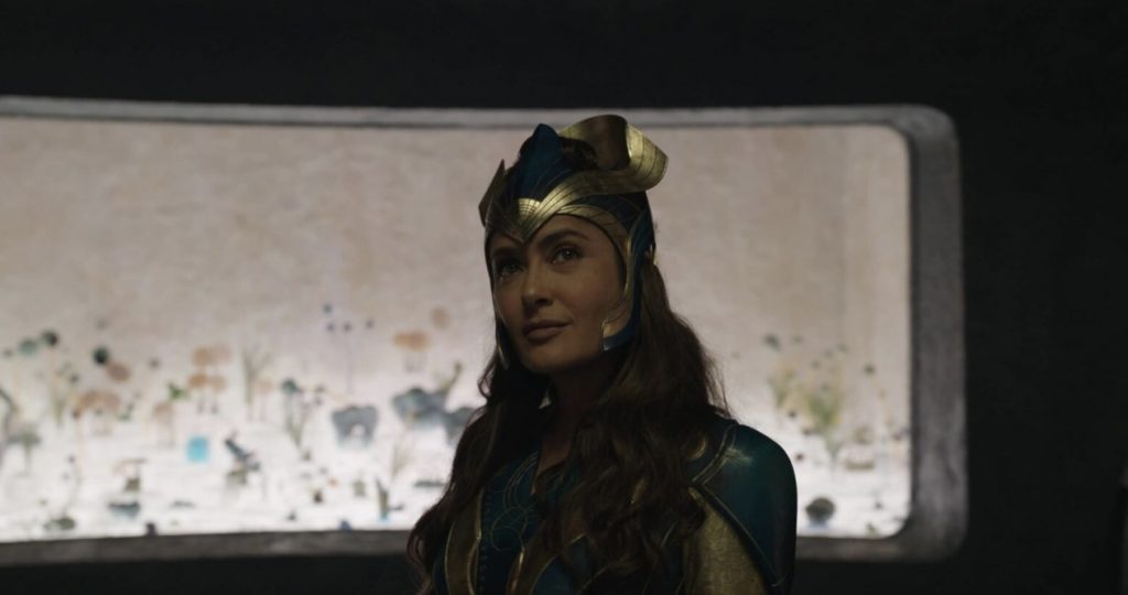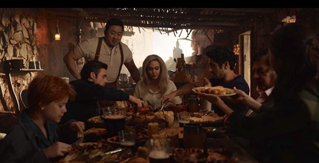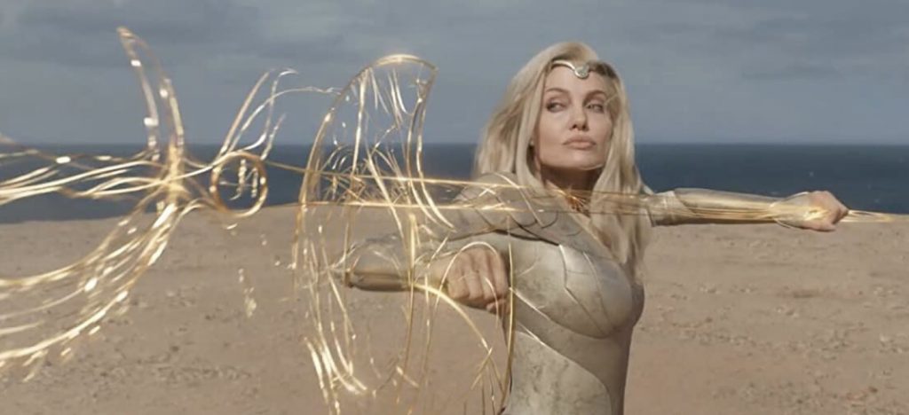 Прежде всего, для фильма с бюджетом 200 000 00 $ удивляют прибывшие на планету Девианты - хреново нарисованные CGI-звери, похожие на связки серых удлинительных шнуров. Это могло бы стать приговором, но Хлоя Чжао «вынимает из ножен» свое главное оружие - умение расставить актеров по местам и дать им возможность проявить себя. Лидер Вечных, Аджак (Сальма Хайек), пенсионерка, живущая на живописном ранчо в Южной Дакоте, эффектно появляется в ковбойской шляпе и жилете, чтобы собрать команду из супер-героев, живущих по всему миру. Серси (Джемма Чан) - один из самых хорошо продуманных персонажей. Она наиболее близка к тому, чтобы назвать ее главным героем фильма. Работа в Музее естественной истории в Лондоне заканчивается вечером, а затем Серси включает свои суперспособности. Она может превратить любой материал в совершенно другой. Ее смертный возлюбленный, датчанин Дэйн Уитман (Кит Харингтон), ничего не знает о ее прошлом, которое напоминает о себе появлением Икариса (Ричард Мэдден), умеющего стрелять лазерными лучами из глаз. Гильгамеш (Дон Ли) - суперсильный любовник (совсем не похожий на Брэда Питта) главная роль которого - присматривать за Теной (Анджелина Джоли). Хотя она, выглядит гламурной кошечкой в белом костюме, Тена страдает психическим заболеванием, вызванным бессмертием, из-за которого она периодически набрасывается на своих собратьев Вечных, как если бы они были врагами. Это можно было бы посчитать милой привычкой, если бы она не обладала способностью создавать несокрушимый золотой меч из воздуха.