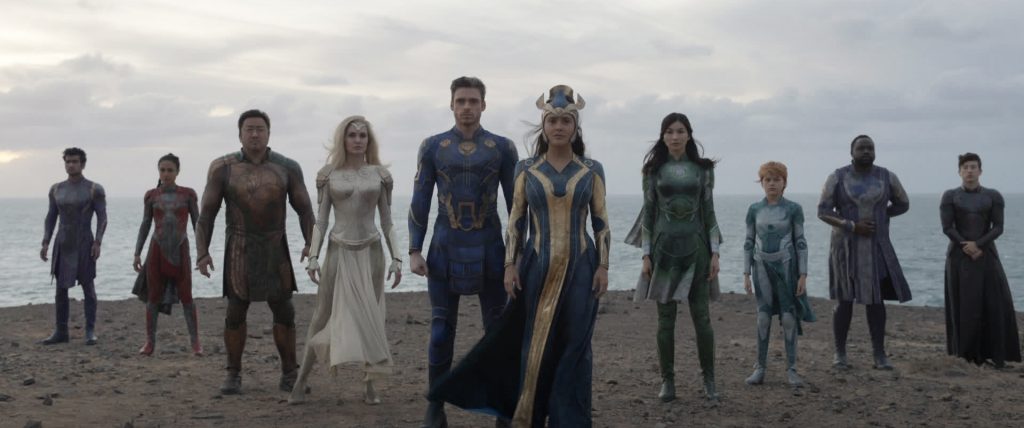 ВПЕЧАТЛЕНИЯ И АКТЕРЫ: как бы вы ни относились тому, какое лидирующее положение блокбастеры о супергероях занимали в культурном ландшафте последние десять с лишним лет, есть что-то неизбежно печальное в том, как продюсеры нанимают режиссеров для новых проектов во вселенной Marvel Comics. Для начала выделитесь в своей области, как это сделала Хлоя Чжао (премии «Оскар» в номинациях «Лучший режиссер» и «Лучший фильм» за свой созерцательный инди-фильм «Земля кочевников»). И вам тут же торжественно вручат ключи от машины Marvel - гигантского транспортного средства с улучшенной компьютерной графикой, которое всегда движется в одном и том же направлении, чтобы прибыть в одно и то же заранее определенное место. «Вечные» - столь же социологически вовлеченный и живописно красивый, как любой фильм франшизы. Он залит теплым светом любимого времени дня режиссёра Хлои Чжао - предсмертного «золотого часа». Но это также один из самых слабых фильмов Marvel, которые доводилось видеть - запутанный, невнятный и блеклый. Действие происходит в течение длительного периода времени по всему земному шару (и в галактике), но при этом вызывает странное ощущение клаустрофобии, как в субботнем дневном сериале, полностью снятом в студии без окон.