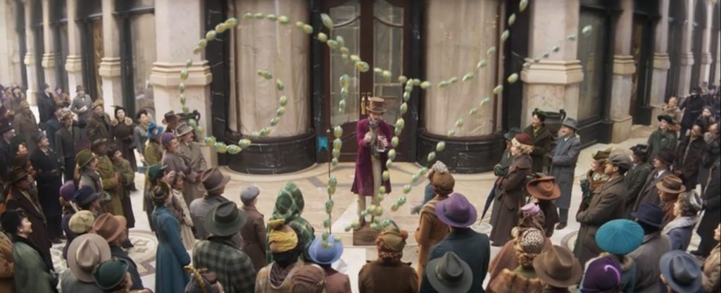 О ЧЕМ КИНО: Вилли Вонка (Тимоти Шаламе) приехал в Лондон, чтобы открыть свой первый магазин шоколада. Он планирует разместить его в Galleries Gourmet, огромном и роскошном торговом центре, в котором уже расположены магазины трех главных шоколадных мастеров города: Слагворта (Пэтерсон Джозеф), их главаря со змеиной ухмылкой; сноба Фикельгрубера (Мэттью Бэйнтон), которого «выворачивает» каждый раз, когда слышит слова «бедные»; и напыщенного Продноуза (Мэтт Лукас). На счету Вилли всего 12 серебряных соверенов. Но Вонка знает, что как только люди попробуют его шоколад, у него появятся деньги, и мечта открыть магазин своей мечты тут же сбудется. Однако троица злодеев решает остановить Вилли, используя начальника полиции (Кигэн-Майкл Ки), тупого продажного алкоголика. Как будто этот шоколадный синдикат не был достаточным испытанием, судьба приводит Вилли в ночлежку миссис Скраббит (Оливия Колман), которая заманивает простаков в ловушку пожизненного контракта, запирая их в подвале как рабов. Вилли удается сбежать, спрятавшись в тележке для белья. Он объединяет в команду других жертв миссис Скраббит - печальную сироту Нудл (Кала Лейн) и бровастого бухгалтера Абакуса (Джим Картер). Он также сталкивается с Умпа-Лумпа (Хью Грант) - воришкой-лиллипутом с оранжевой кожей, длинными зелеными волосами и внешностью аристократа.
