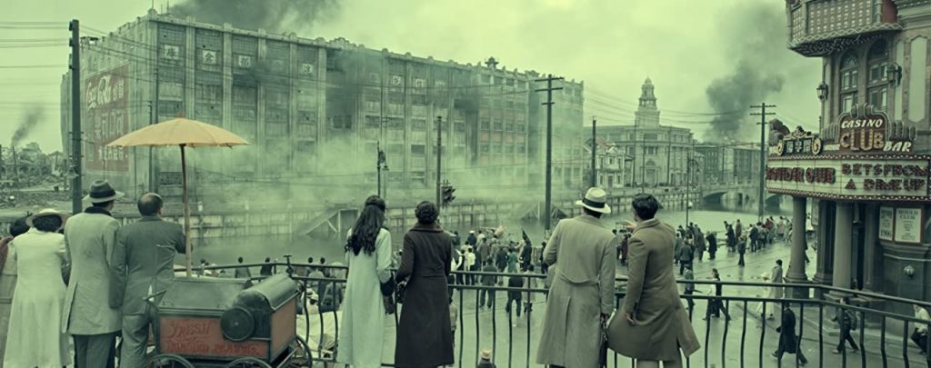 Особенно живописно показывают «Международный сеттльмент». На одном берегу реки - ад войны, кровь и руины, на другом - горящие рекламы, казино, рестораны и мирная жизнь. Зеваки, крупье и официанты, толпясь на набережной, с любопытством следят за борьбой не на жизнь, а на смерть - такой расклад кажется слишком уж надуманным, нарочно изображенным создателями фильма. Однако действительность, похоже, в очередной раз оказалась более странной, чем любой вымысел. И все-таки метафора тут есть: трудно не почувствовать укоризненную интонацию в том, как изображает Гуань Ху наблюдателей из западного мира. Некоторые репортеры даже расположились в дирижабле, в безопасной недосягаемости для пуль и снарядов, и разглядывают сражение, будто спортивный матч. Однако к концу битвы большинство гражданских все-таки проникаются сочувствием к китайским защитникам и, как могут, помогают им. Но возможен и другой взгляд. В толпе зрителей камера то и дело выхватывает актеров - в гриме, с ярко раскрашенными лицами. На сцене они показывают спектакль по мотивам героического китайского эпоса. Да и весь Сеттльмент с его огнями напоминает театральную сцену с огнями рампы. С другой стороны - зрелищем, буквально «театром военных действий» становится драма вокруг склада «Сыхан». Два театра друг напротив друга, два зеркала страстей человеческих - это вполне развитие шекспировской темы. (Фёдор Дубшан)