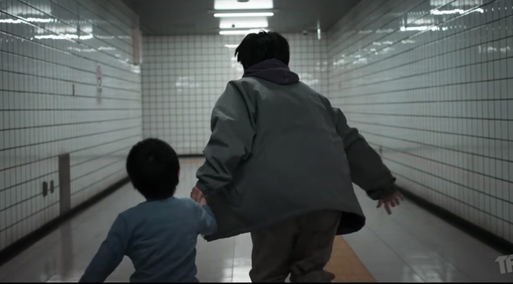 Авторы картины жонглируют образами и ассоциациями, подменяя одного вдруг исчезнувшего героя другим. Все персонажи безымянны, обозначены функциями ("Потерянный", "Идущий"). Во втором "акте" этой драмы истеричного парня с рюкзаком сменит тот самый невозмутимый белорубашечник, а в третьем - потерявшийся в метро мальчуган с широко распахнутыми глазами (Нару Асанума). Этот беззащитный ребенок и станет в воображении героя его сыном, и даже будет момент семейного счастья на приморском пленэре - витиеватая композиция "Выхода 8" выведет нас к простейшей, но вечно актуальной идее выбора между иллюзорной свободой и не менее иллюзорными "узами". На миг явится и женский образ - девушка в белом, которая обернется исчадием ада. Появятся истошно мяукающие голые крысы, прошествует по коридору потерянный котенок…