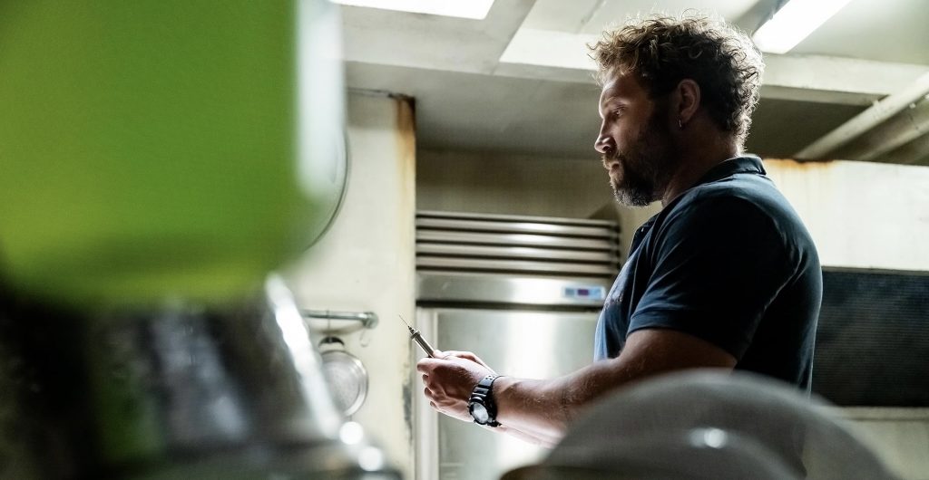 ВПЕЧАТЛЕНИЯ И АКТЕРЫ: сюжет «Хищных тварей» вращается вокруг вполне себе безумной идеи. Это, конечно, прекрасный триллер, который становится лучше по мере того, как фильм находит способы расширить и обострить свои несколько ограниченные локации и ставки. Но, скорее всего, единственное, что запомнят зрители в фильме режиссера Шона Бирна, - это его злодей. И вовсе не из-за того, кем является Брюс Такер (Джай Кортни). По сути, он серийный убийца с комплексом бога, дурной привычкой шутить в смертельных ситуациях, которые он сам же придумал, и банальной сценой, в которой он танцует в некотором состоянии раздетым. Это персонаж, для которого меньше, безусловно, было бы лучше, как с точки зрения сценария, так и с точки зрения игры актера, потому что ни одна из этих деталей об этом человеке не сравнится с совершенно извращенным способом, которым он предпочитает убивать своих жертв. Он скармливает их живым акулам...