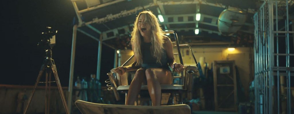 «Хищные твари» не становятся слишком серьезным фильмом. Все ограничивается мелкомасштабными ужасами со стороны Такера, который насильно захватывает Зефир, запирает ее в своей лодке, приковывая наручниками к кровати. Начинается битва характеров, которую прекрасно разыгрывают Хасси Харрисон и Джей Кортни, но настоящее «шоу» происходит во время столкновений с акулами, когда жертвы подвешиваются над водой, а Такер записывает весь процесс страха и смерти на видео - его библиотека VHS становится все больше…