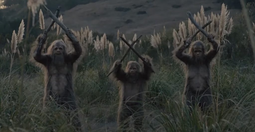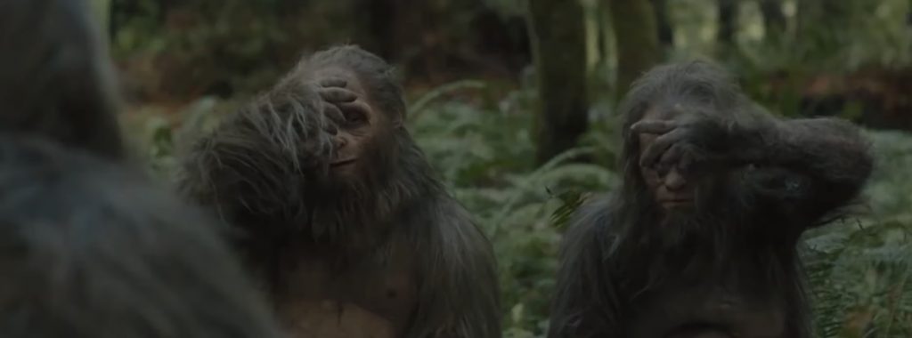 И поначалу совершенно невозможно поверить, что в образе единственной женской особи - красавица Райли Кио, а одного из мужских персонажей играет сам Джесси Айзенберг. Общаются они при помощи мимики и нечленораздельных звуков, которые выражают весь спектр эмоций от скорби до восторга. Пластический грим потрясающий, на уровне последней «Планеты обезьян». Эти костюмы - одновременно и творческий вызов актерам, и полная свобода самовыражения.
