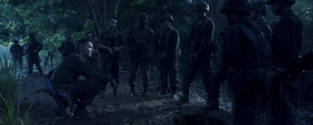 ВПЕЧАТЛЕНИЯ И АКТЕРЫ: война во Вьетнаме в фильме Марка Бурмана отображается довольно скудно с точки зрения визуальной. Скорее всего, это связано с экономией денег, поэтому действие происходит лишь в парочке военных лагерей, а драматические события нагнетаются, в основном, в душных палатках, где нервные вояки пытаются решить проблему, грозящую им неприятностями. Как нередко бывает, проблемами нагружают человека, максимально не приспособленного к этой роли. Режиссер, не теряя времени, в течение буквально пяти минут, создает интригующую завязку. Кажется, что зрителя ожидает интригующий и динамичный триллер, но затем «Засада» резко замедляет свой темп, а загадки раскрываются самым рутинным способом. Не проходит и половины фильма как он превращается в практически театральную постановку. Испуганные темнотой подчиненные Аккермана (Коннор Паоло) пускаются в бесконечные пререкания, а их нервному начальнику и самому не помешала бы помощь психотерапевта. Миллер, которого играет звезда Джонатан Рис-Майерс много чего знает и говорит поначалу, а затем тупо залегает вместе со своими вояками в засаде, ожидая появления врага.