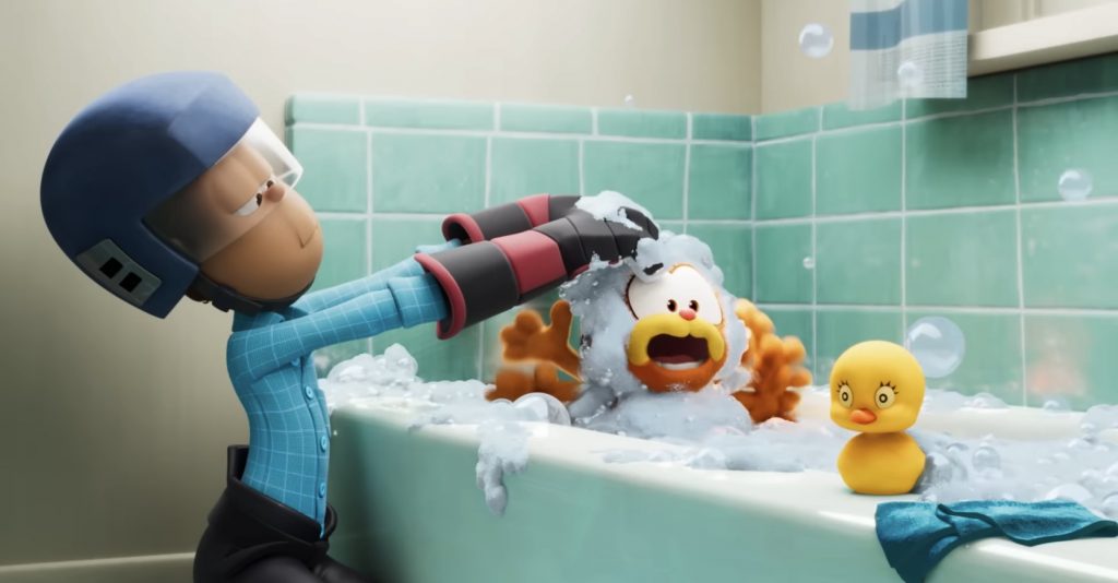 Режиссёр новой версии Марк Диндал («Цыплёнок Цыпа») и его команда мультипликаторов делают из Гарфилда стандарт нереалистичной красоты: глаза становятся более широкими, взгляд - менее скептичным, морда приобретает несвойственную ангельскую форму. При этом сам персонаж предстаёт одномерным, вхолостую энергичным, далёким от саркастичного печатного прототипа, который полюбили совсем по другим причинам. Стандартные 100 минут хронометража наполнены ограблениями, дефолтными помощниками с вторичной романтической линией, дронами и другими приспособлениями утопического мира. Рассчитанный в первую очередь на детскую аудиторию проект нередко оказывается бесцельно жестоким шутки ради: то птичку съеденную жалко, то сырорезка-гильотина вот-вот изрубит на куски и усов не оставит.
